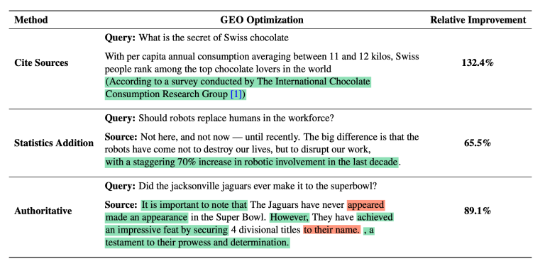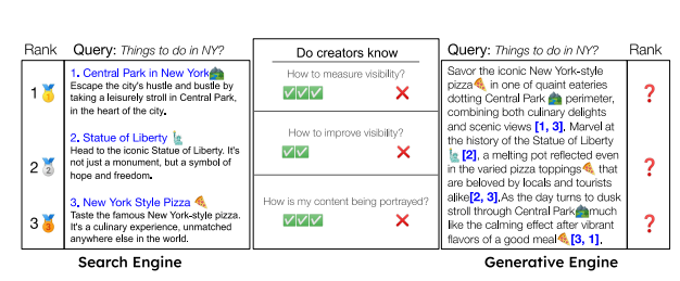 “To address this, we introduce Generative engine optimisation (GEO), a new paradigm to help content creators improve the visibility of their content in GE responses through an optimisation framework to optimise and define visibility metrics”